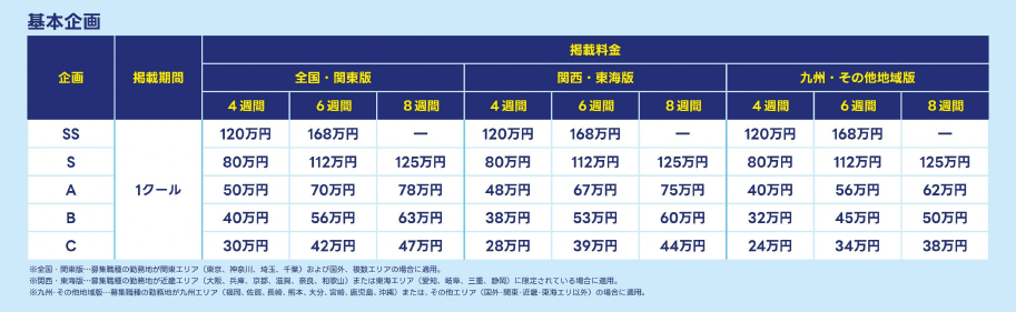 SS…圧倒的な露出力を誇る最上位企画。1ページ目への優先表示に加え、毎日80通配信できるデイリースカウトで、母集団形成を最大化します。