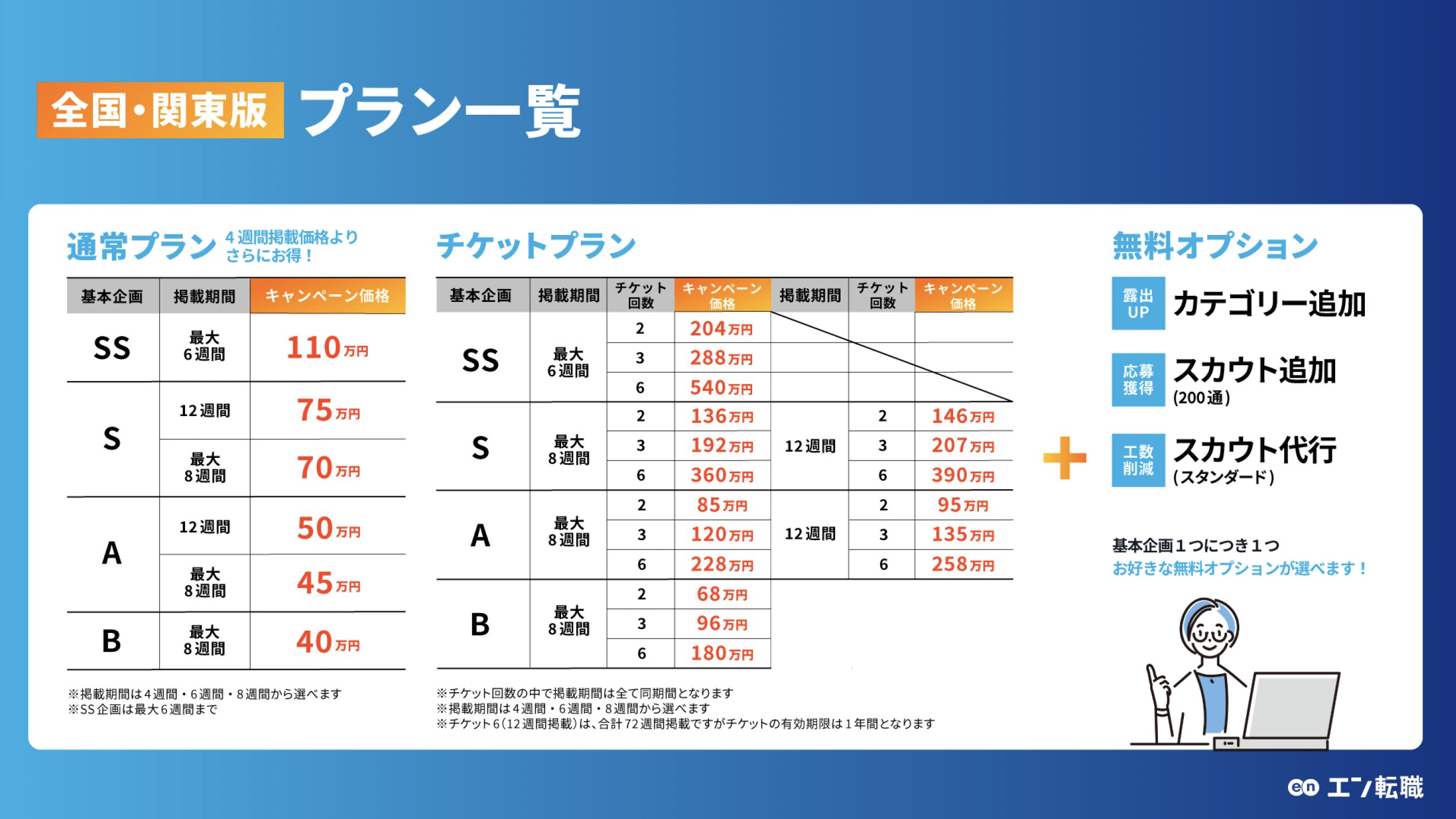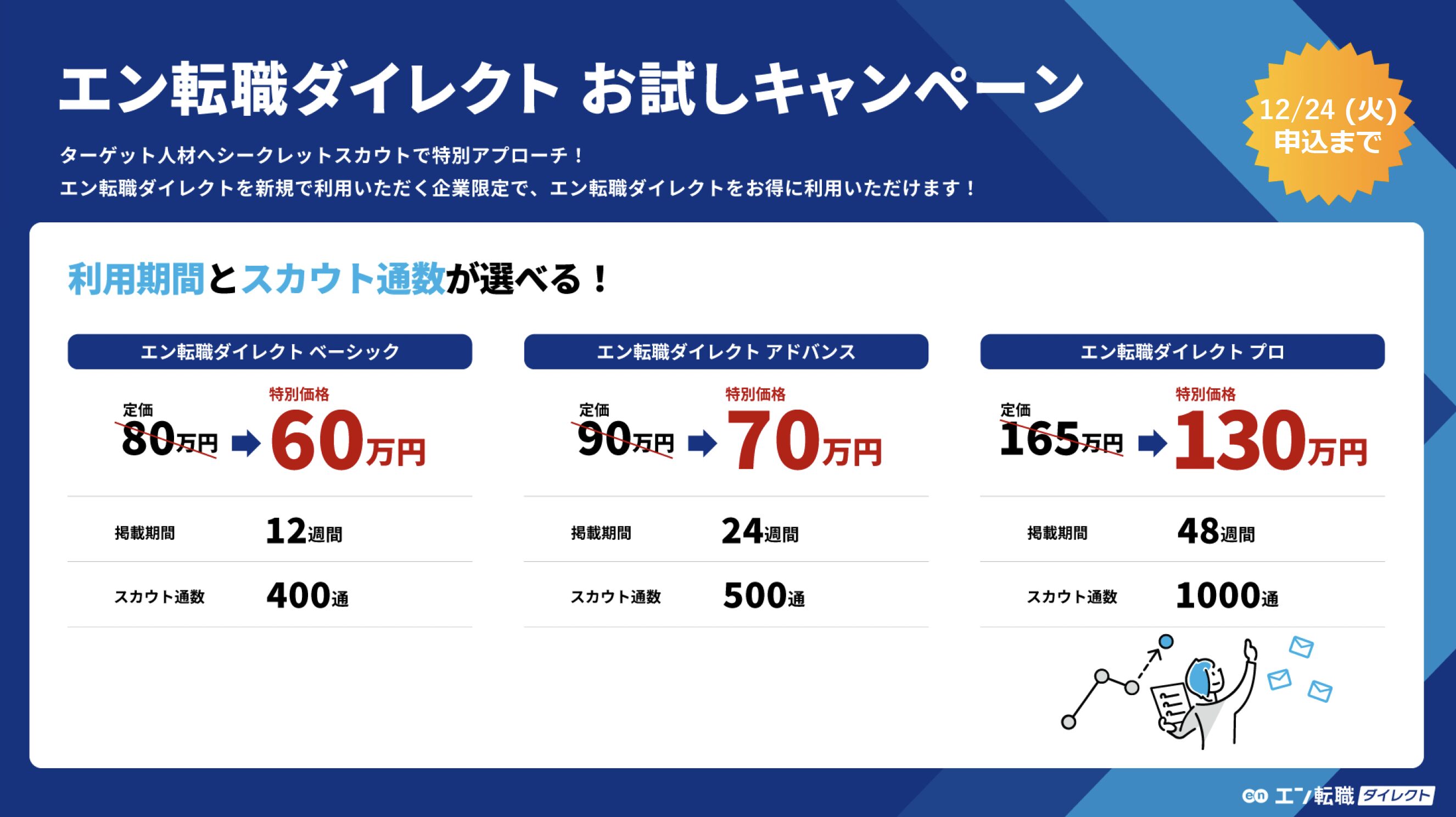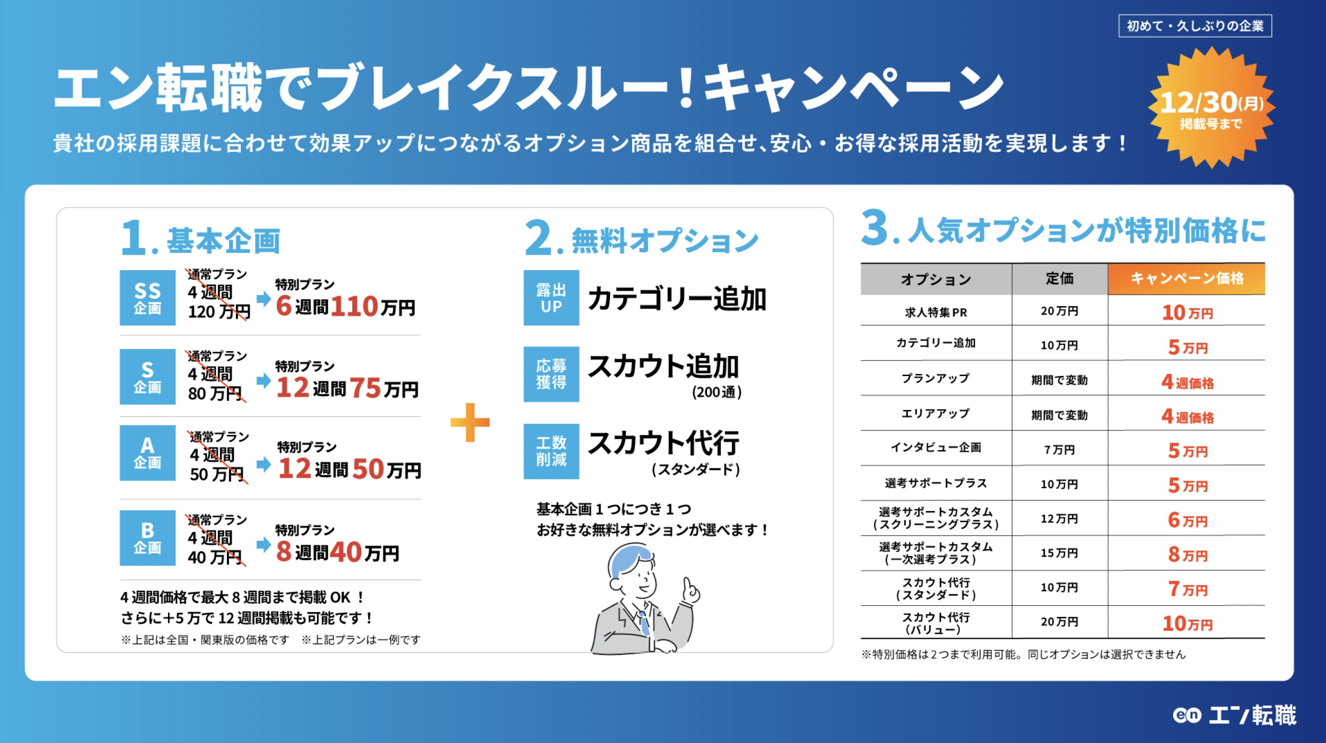 エン転職 エン転職の取り扱いを開始しました! 2024年12月より、エン転職の取り扱いを開始いたしました! 下記たいへんお得なキャンペーンも実施中ですので、エン転職での掲載をご検討中の方はお気軽にご相談・お問い合わせください!