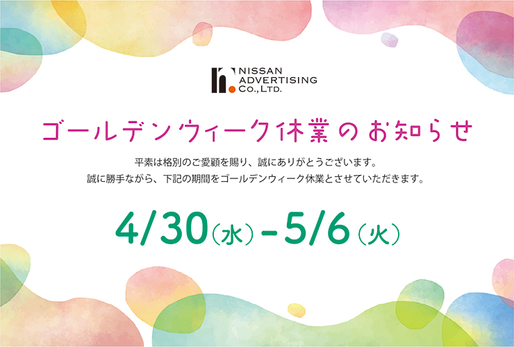 さて、誠に勝手ではございますが、弊社のゴールデンウィーク休業を下記においてお知らせいたします。