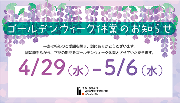 お知らせ ゴールデンウィーク休業のお知らせ お取引先様各位 平素よりお世話になっております。 さて、誠に勝手ではございますが、弊社のゴールデンウィーク休業を下記においてお知らせいたします。 ==================== 休業期間:2026/4/29(水)~5/6(水) ==================== ご迷惑をおかけいたしますが、何卒よろしくお願いいたします。