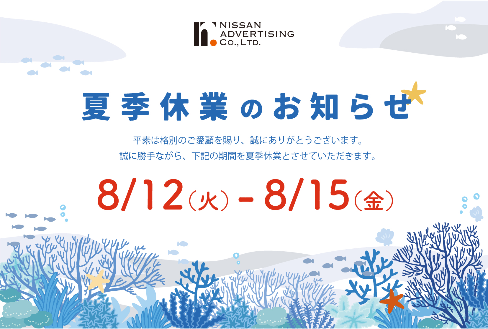 お知らせ 夏季休業のお知らせ お取引先様各位 平素よりお世話になっております。 さて、誠に勝手ではございますが、弊社の夏季休業を下記においてお知らせいたします。 ==================== 休業期間:2025/8/12(火)〜8/15(金) ==================== ご迷惑をおかけいたしますが、何卒よろしくお願いいたします。