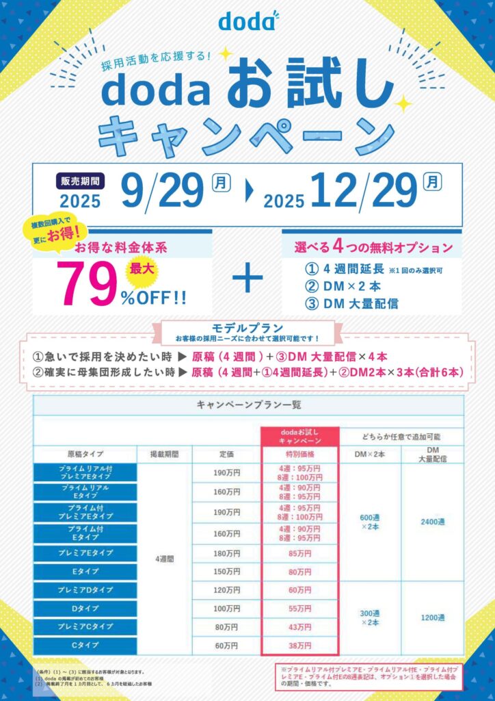ただいま日産広告社では、dodaの掲載が初めて、または半年以上のブランクのある企業様向けに、たいへんお得にdodaをお試しいただけるキャンペーンを実施中。